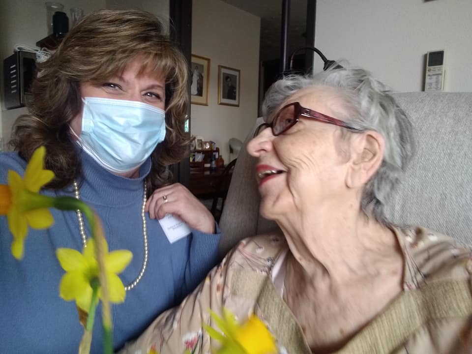 I found Mom in the lobby looking lovely in a yellow sweater. She’d visited the hair salon and had her photo taken because it was the facility’s picture day.