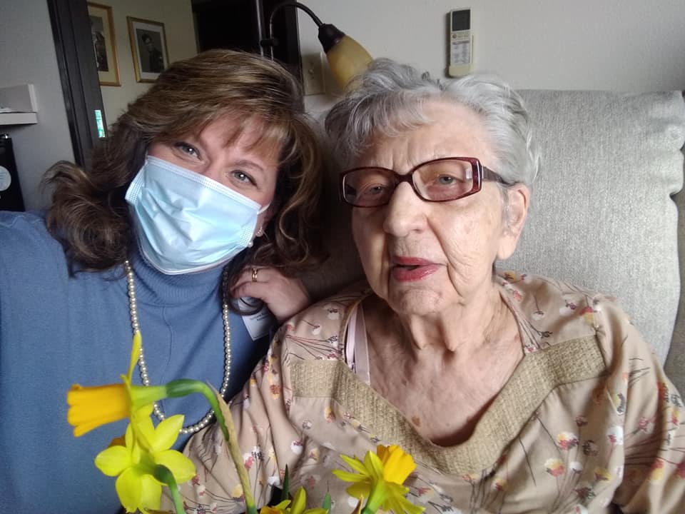 I found Mom in the lobby looking lovely in a yellow sweater. She’d visited the hair salon and had her photo taken because it was the facility’s picture day.